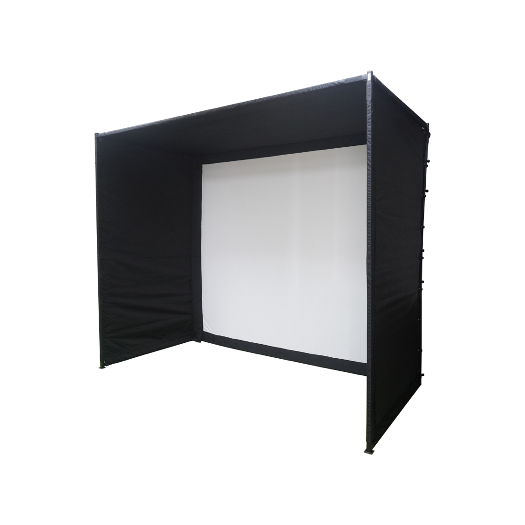 A modern enclosure design featuring black square poles and enhanced blackout protection.