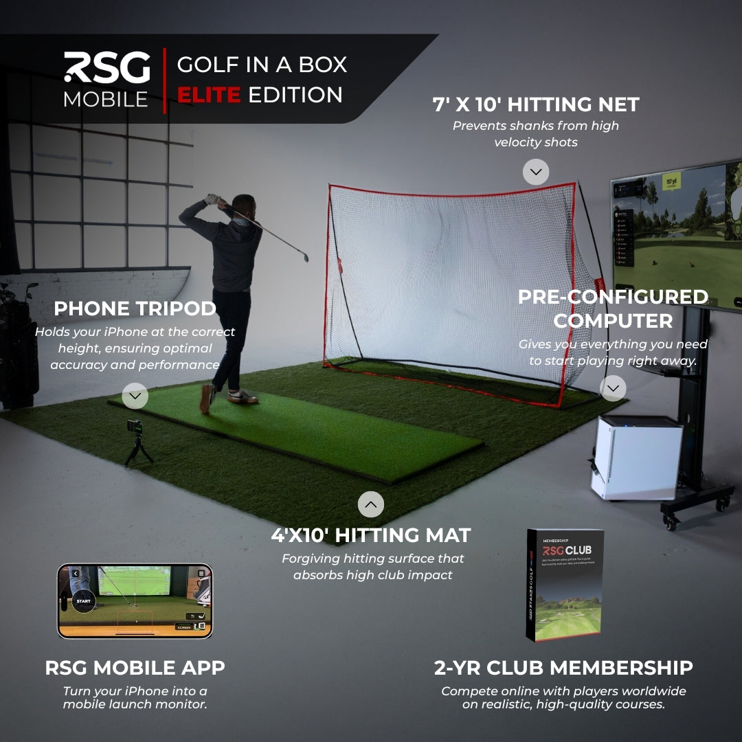 The best value in golf simulation, hands down. A complete golf simulation system in one package. This all-inclusive bundle combines iPhone-based tracking with a pre-configured gaming computer, premium mat, and two years of RSG Club membership. Everything you need arrives ready to play – no technical setup required.